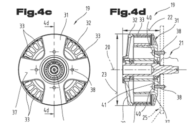 According to claim 1 of AR1, the electric motor (17) is formed by a disc motor (19) whose axial length (22) extending in parallel to the longitudinal axis of its output shaft (21) is shorter than its outer diameter (23) [claim 1] and the disc motor (19) is designed as an outer runner electric motor with internal fixed stator (31) and external, rotationally movable rotor (32), wherein the output shaft (21) which is designed on the rotor (32) passes through the stator (31) in the axial direction of the output shaft (21) [claim 2].